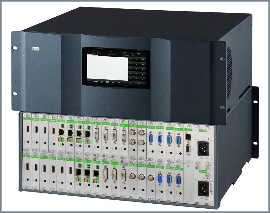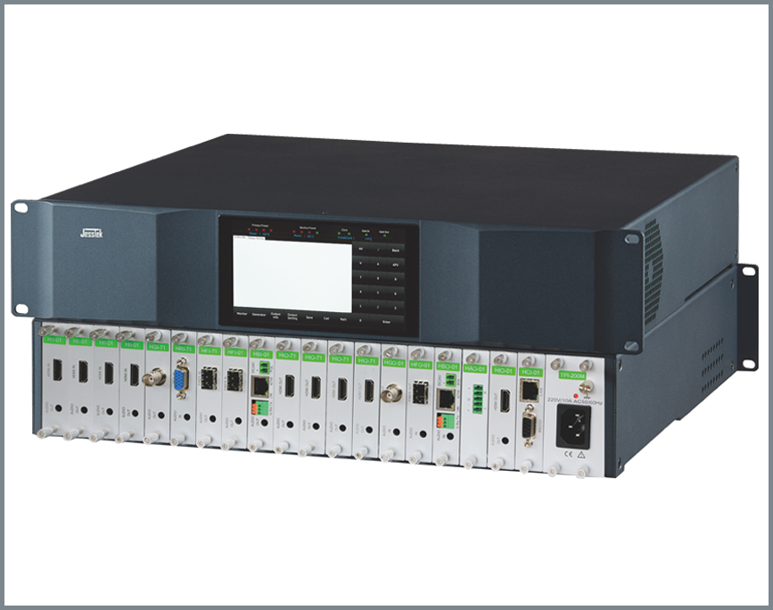 4K高清混插矩陣是?款最高支持4KP30的單路單卡混合插卡矩陣,通過(guò)框架的模具+模塊化、內(nèi)部結(jié)構(gòu)的 專(zhuān)業(yè)化+智能化、電氣線路的優(yōu)化+標(biāo)準(zhǔn)化等手段,匠心設(shè)計(jì),鍛造出的?款外形美觀漂亮、結(jié)構(gòu)合理牢固、性能優(yōu)越穩(wěn)定 的4K高端無(wú)縫切換矩陣。整個(gè)系列分五個(gè)19英寸標(biāo)準(zhǔn)機(jī)型,分別是2U的9 x9、4U的18 x18、8U的36 x36、17U的72 x 72和32U的144 x144。此系列4K無(wú)縫切換矩陣,將智能化、網(wǎng)絡(luò)化、模塊化、數(shù)字化和音頻加解嵌技術(shù)融為?體,采用最經(jīng)濟(jì)的單路單卡 結(jié)構(gòu),每通道帶寬為18Gbps的四總線設(shè)計(jì),采用4:4:4無(wú)壓縮的采樣技術(shù); 6英寸1920 x1080顯示器及多點(diǎn)電容觸摸屏,具有強(qiáng)大的交互式觸摸控制功能和點(diǎn)對(duì)點(diǎn)監(jiān)視1080信號(hào)的功能;通過(guò)兩者配合,方便在工地現(xiàn)場(chǎng)對(duì)系統(tǒng)進(jìn)行檢測(cè)、調(diào)試。 最高支持4KP30信號(hào)無(wú)縫切換輸出,具有上、下變換的無(wú)縫切換功能,兼容HDMI1.4和3D信號(hào)。同時(shí),也可配置相對(duì)經(jīng)濟(jì)的快切輸出卡,配置靈活多樣。輸入可選CVBS、Y'PBPR、VGA、DVI(兼容HDMI)、 3G-SDI(向下兼容HD和SD)、6G-SDI(向下兼容)、HDMI、2K- Fiber、4K-Fiber、HDBaseT等接口形式。4K及下變換的?縫輸出通過(guò)HDMI?縫卡+所需接?轉(zhuǎn)換器?式;經(jīng)濟(jì)的快切輸出卡為最??持4K的透?jìng)骺?,支持的接口有:HDMI (兼容DVI)、Fiber、HDBaseT、SDI等。